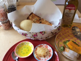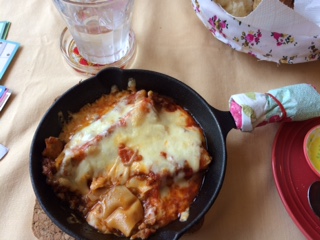 私が注文したのは、ラザーニャ(手作りパンと温野菜付き)