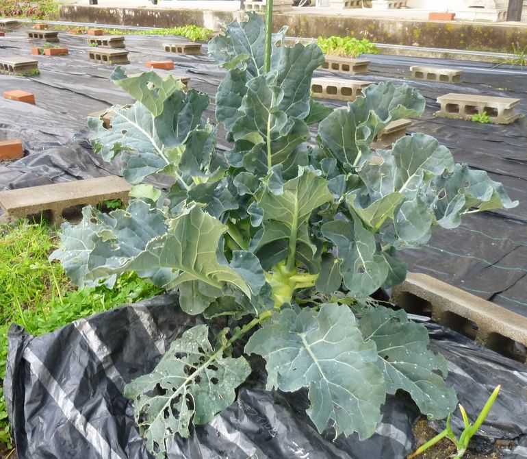 40㎝程度に伸びた株元の葉から随時収穫する。若々しい健全な葉を下部よりかいて収穫します。基本的に、葉の黄化は下部より進行していきますので収穫のタイミングを逃さないように注意。