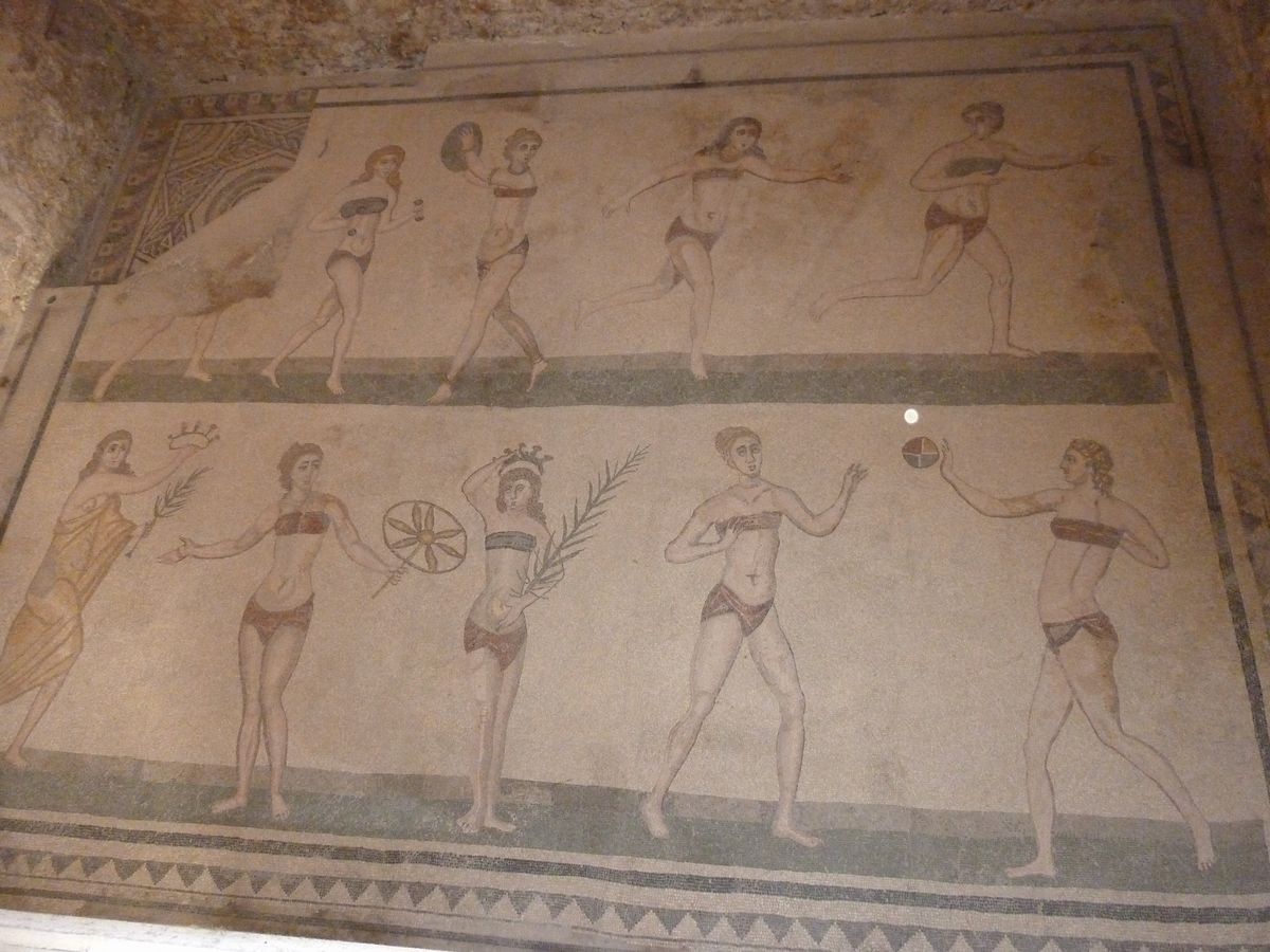 ビキニを着た乙女のモザイク画の床。