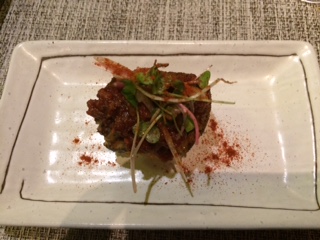前菜:長崎産秋サバの炙り ホタテとトマトの