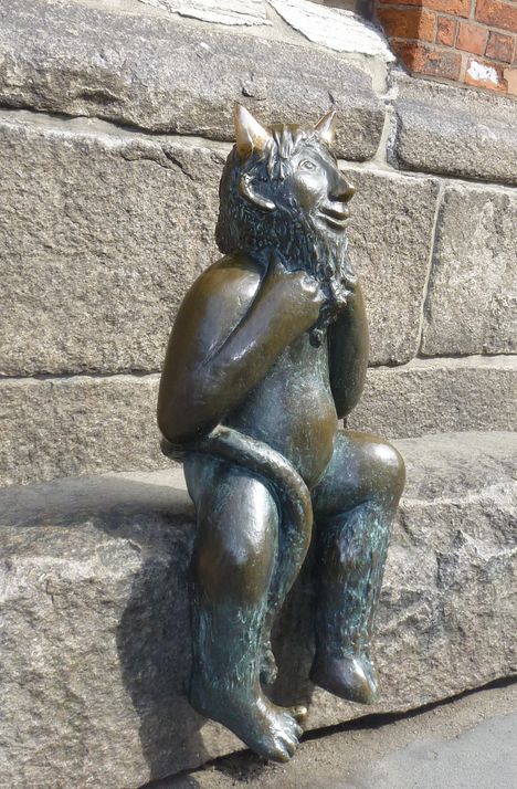 写真は聖マリエン教会の建物の外側に座っている 人間の大きさほどもある悪魔です。