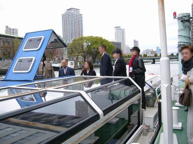 土佐堀川の水深が浅いため、橋の下をくぐるとき、ガラス張りの天井が、