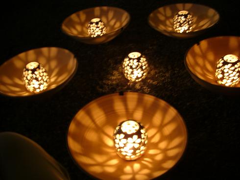 素焼きの小さい皿や土鍋を網に入れて吊るし、