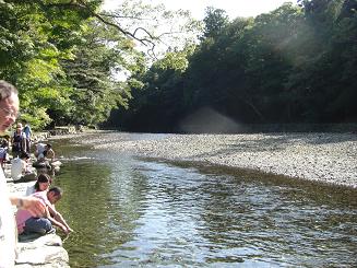 横の仮設の橋を渡り、五十鈴川で参拝する前に手を清めて