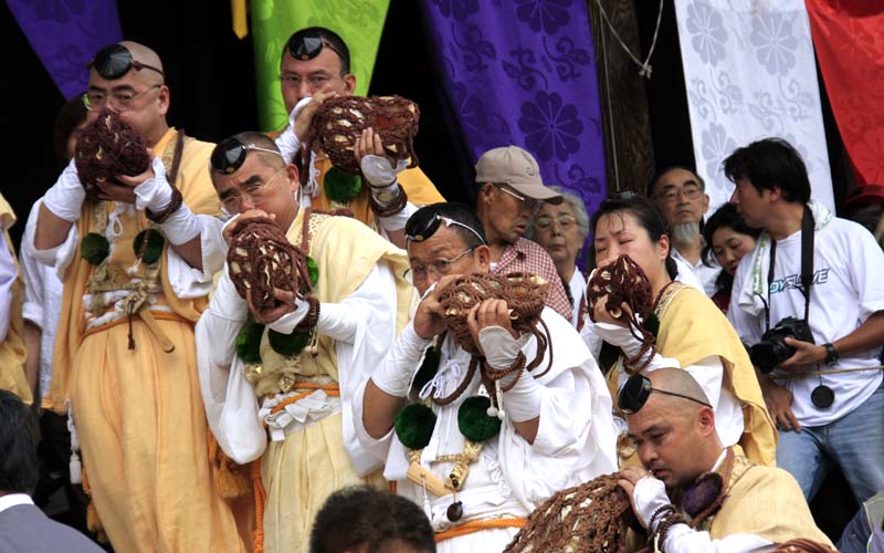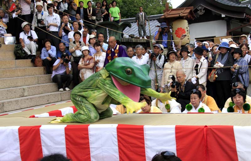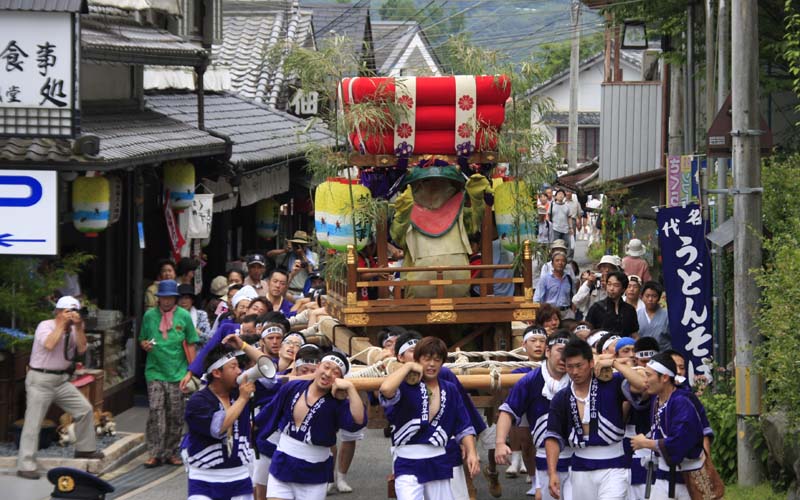 蛙とび行事は、大青蛙を乗せた太鼓台が蔵王堂へ練り込み、