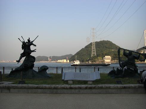 壇ノ浦古戦場を一望できると言う事で、平知盛と源義経の像もありました。