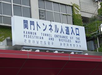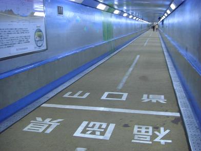 山口県と福岡県の県境を示す表示があり、歩いてこの境界線を越えるとき