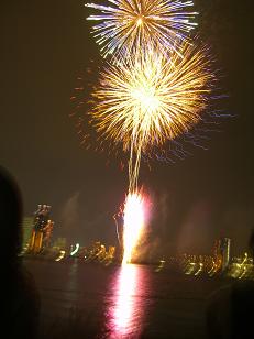 目の前の淀川の真ん中で花火があがります。