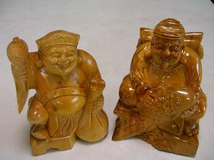 「恵比寿・大黒」と「豚」の木の彫り物です。