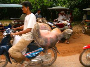 生きた豚が、仰向けにバイクに縛り付けられて移動。