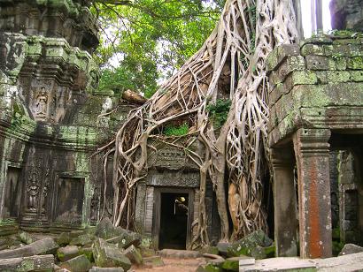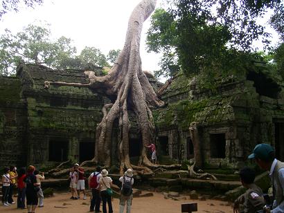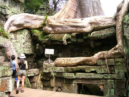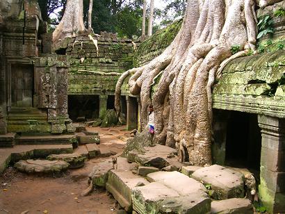 鳥が運ぶ木の種が大きく成長し、今では、巨大な樹木が遺跡を覆っています。