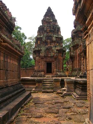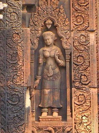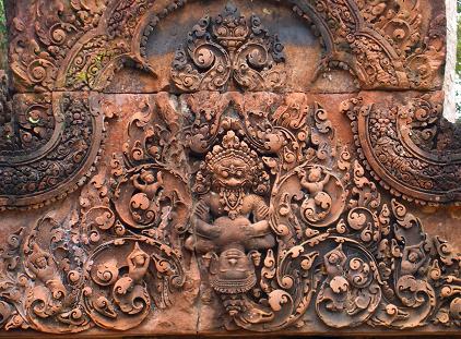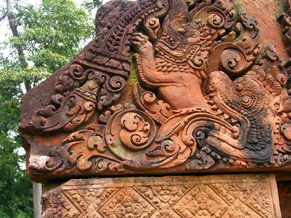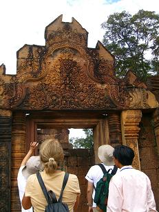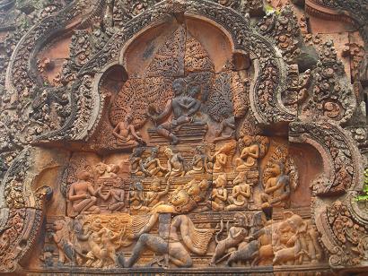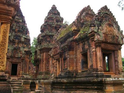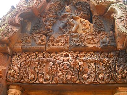 「女の砦」を意味しています。紅色砂岩で彫刻されていてアンコール遺跡の中でも格調の高さを感じます。