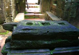 東塔門と中央伽藍の間に置かれた石棺で死者を荼毘に付した際、死者をかたどった線と違う向きの線を描く儀式が行われたと言うことから「体を「ひっくり返す。」の意味を持つヒンドゥ教寺院。