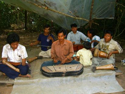 左:地雷で足をなくした人が楽器を演奏しています。義足を横に置いて。