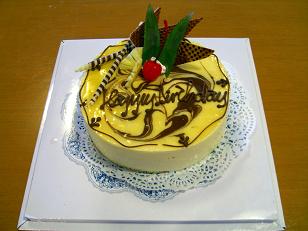 右:併設のホテルから、届いたバースディーケーキ。