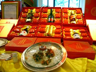 中身は、はすの実、青豆、ナッツ、フルーツの砂糖漬、サラミ、卵など様々・・・