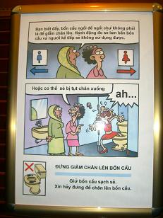 ベトナムのローカルはベトナム式和式なので、洋式トイレの便座の上に乗らないように、という注意書きでのようです。