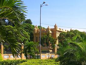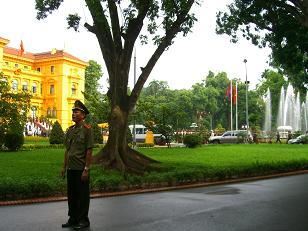 黄色の建物は迎賓館。今日はラオスの旗があがり、軍隊が入って来ました。誰かラオスの要人がここに今、到着したようです。