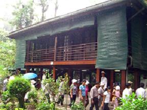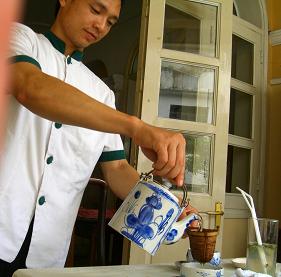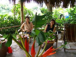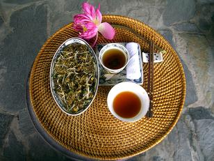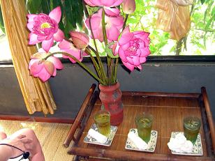 庭にある南国風の建物の中で、ホータイからの涼しい風に吹かれながらお茶とベトナム料理の一品(鰻の入った春雨いため)を頂きます。