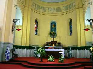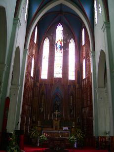 右の写真は教会内:正面にはマリア様、左はジャンヌダルク、右が初代司祭ティオファヌヴナールのステンドグラスがはめ込まれています。