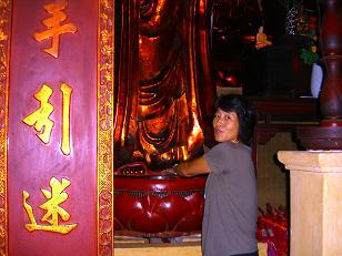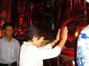 お寺の人に、仏様の衣にお金を置き、仏様の足や衣にさわり、その後で自分の足などを触るよう勧めれれました。きっとご利益があるのでしょう。