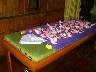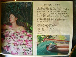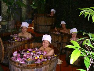 泥を洗い流し、蓮の花を一杯浮かべた「フラワーバス」へ。凄く贅沢な気分です。