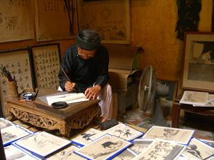 墨絵を描くおじいいさんがいます。