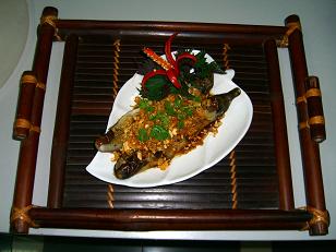 焼きなすは、ベトナムのタレをかけ、上からピーナツ、ニンニク、揚げた赤シャロットをスライスして炒めたものや、コリアンダーを乗せます。けっこうイケル味。
