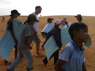 このプラスチックの板は砂丘を滑り降りるためのもので、それを貸し付ける商売をしいているのです。
