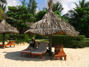 ヤシの木に囲まれた芝生の敷地に、バンガローがあり、プライベートビーチになっていて、目の前が海です。